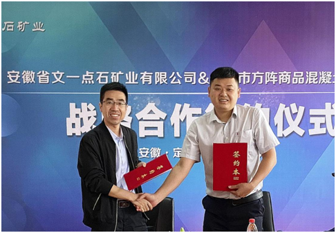 9月28日下午,安徽省文一点石矿业有限公司与蚌埠市方阵商品混凝土有限公司战略合作签约仪式在点石矿业会议室举行。蚌埠市方阵商品混凝土有限公司董事长袁保锋,合肥天裕建材有限公司董事长杨仁东、文一点石矿业矿长许一夫等出席签约仪式,双方立足长远,共话战略蓝图。