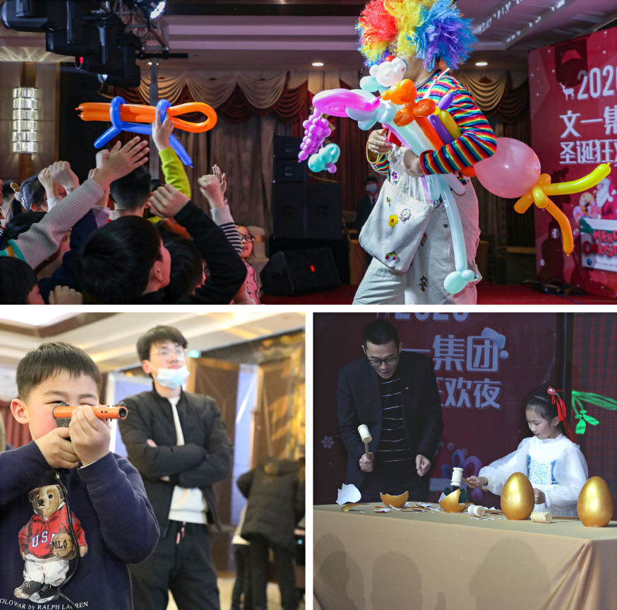 韦书记致辞之后,圣诞狂欢夜表演环节正式开始。无论是精彩演唱、搞笑脱口秀、摇号砸金蛋环节,还是圣诞小丑现场表演童趣十足的气球游戏,都生动展示出文一多元开放、充满活力的企业文化氛围和积极向上精神内涵。晚会表演环节结束之后,周文育董事长上台与两名幸运观众一同举行了斟酒仪式,并与现场所有文一同仁及家人举杯同庆,恭祝圣诞,共迎新气象。