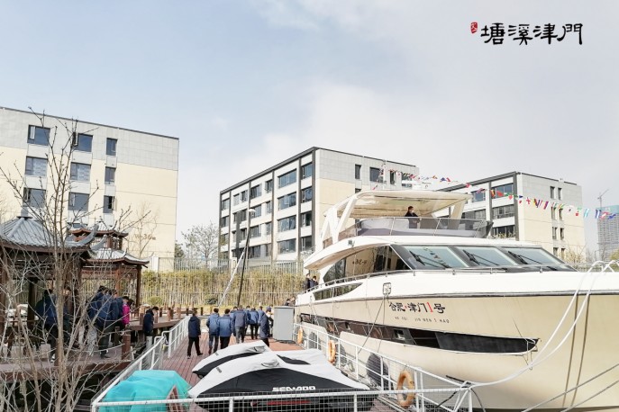 项目周边塘溪河萦绕并川流而过,居于此享受时光的温润。嘉宾们参观之余,还登临停靠在塘溪河畔的“津门1号”豪华游艇,盛赏锦绣山河美景。科大嘉宾在舱内欣赏惬意、畅聊情感的同时,也在舱头远望,品味诗云笼罩下的自然与人文风情。