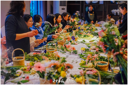 营销中心内花团锦簇,气氛热烈。女神们一展心灵手巧,一幅幅插花作品在手中展现,让爱意在指尖传递,让幸福在花香里流淌。