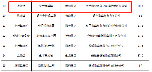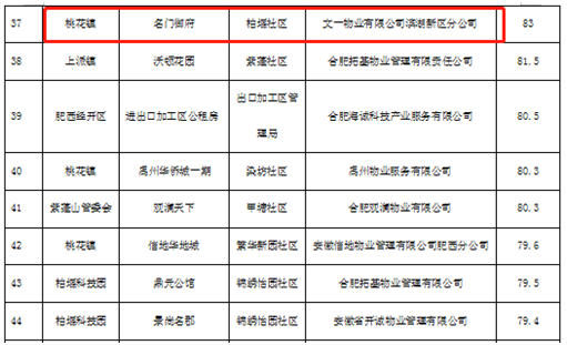 第三方巡查单位对肥西县内16个乡镇园区249个住宅小区日常物业管理服务进行了巡查测评,文一·西溪湾物业、文一·名门御府物业分别获得第19名、第37名。
