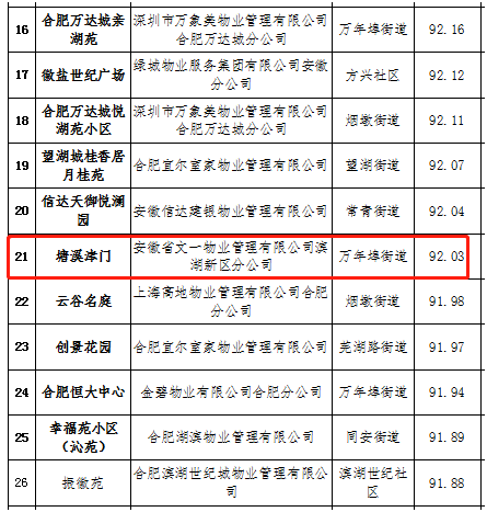 包河区住宅小区1—3月对全区13个街镇(大社区)的549个小区的物业服务质量进行了综合测评,文一·塘溪津门物业位列第21名。