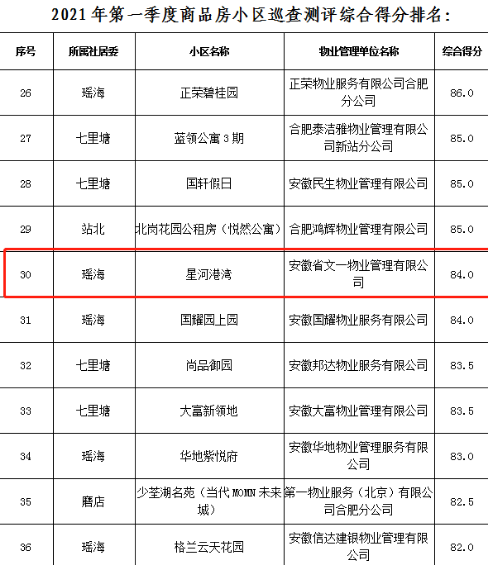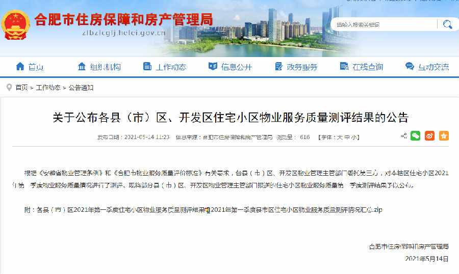 本次排名主要依据《安徽省物业管理条例》和《合肥市物业服务质量评价标准》有关要求,各县(市)区、开发区物业管理主管部门委托第三方,对本辖区住宅小区2021年第一季度物业服务质量情况进行测评,并将所有小区物管单位的测评得分按照列举问题的方式从高到低进行排名,由合肥市住房保障和房产管理局统一发布。