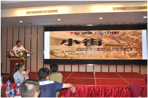 在赵总热情洋溢的致辞之后,文一地产销售公司总经理助理邢瑞峰走上讲台,为众多合作伙伴及业内人士详细解析了名门湖畔的文一百年街及名门南郡的文一小街两个商业地产项目,向与会嘉宾展现了未来投资商业地产的蓬勃态势。