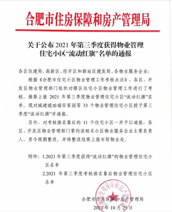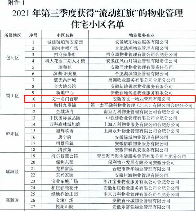 日前,据合肥市住房保障和房产管理局最新颁布文件,文一物业在管项目文一·名门首府以优异的物业管理水平入选名单,获得了合肥市第三季度“流动红旗”荣誉称号。