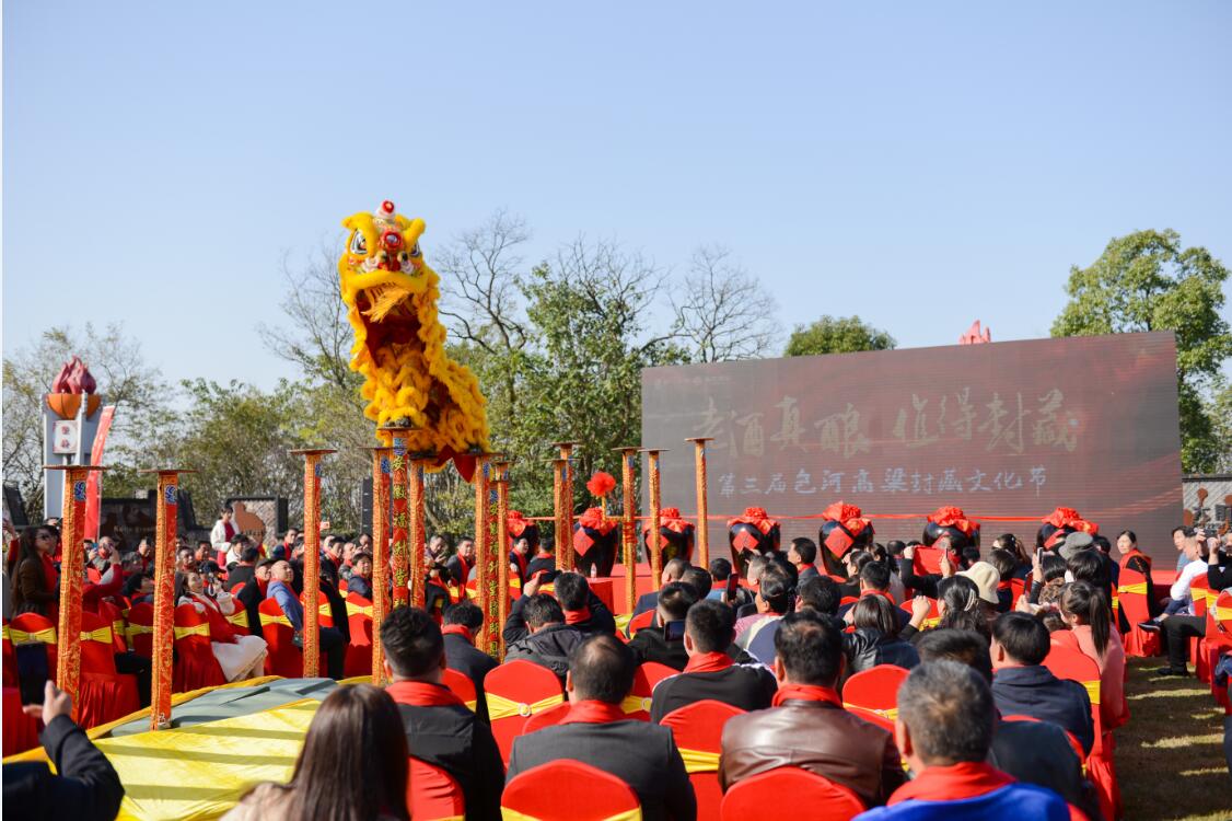 2021年11月13日,天空蓝得透彻,肥东白马山上殷红、金红、橘黄、橙红色的树叶,在艳阳的照耀下,显得格外绚丽,初冬的韵味,愈发浓郁。白马山洞藏基地,酒旗猎猎,歌舞袅袅,热闹非凡。上午9时49分,在欢腾的狮子舞开场舞中,安徽包河酒业有限公司“第三届包河高粱封藏文化节暨‘包河高粱1949’新品上市发布会”拉开了帷幕。