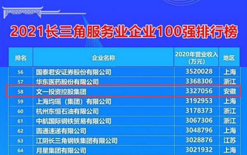 【文一集团】行稳致远 进而有为|文一集团荣登2021长三角企业服务业百强第58位