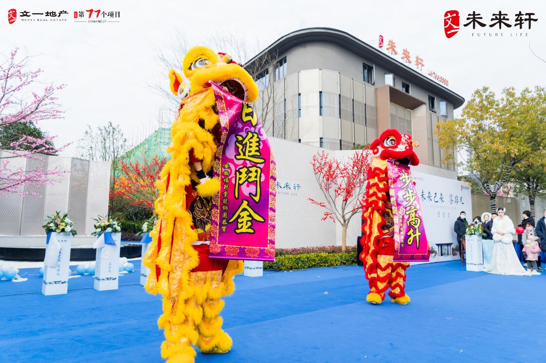 而紧接而来的舞龙舞狮表演再次将现场氛围推向新的高潮,文一房地产集团执行总裁/合肥东区城市公司董事长陈嘉祥轻执朱笔为醒狮点睛,瞬间锣鼓喧天,掌声齐鸣。醒狮献瑞,万福吉祥,现场完美展现了文一·未来轩美学示范区的国韵华彩。