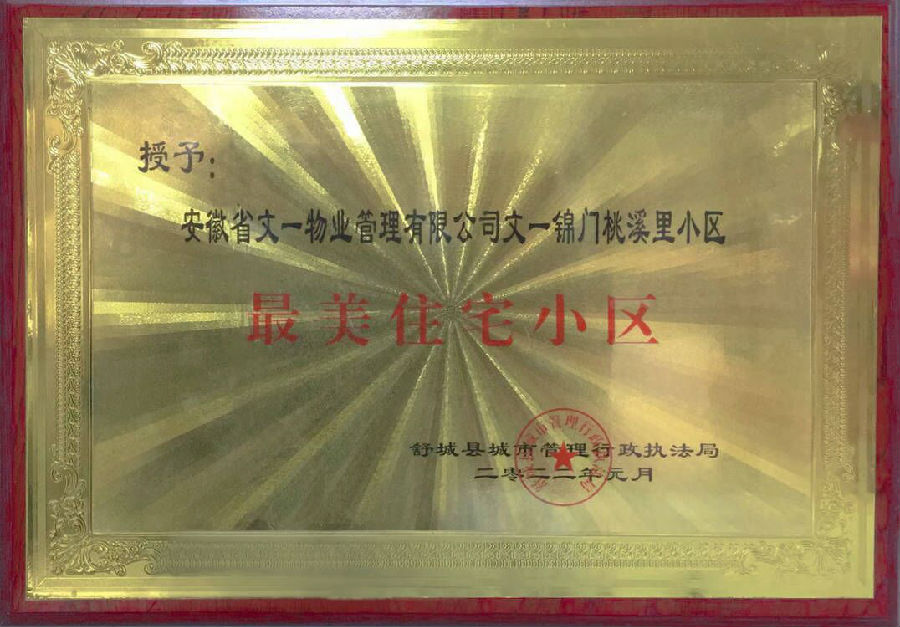 近日,在舒城县物业服务管理中心召开2021年度“最美住宅小区”、“最美物业人”表彰大会上,文一·锦门桃溪里项目获得“最美住宅小区”称号,小区物业管理工作获得上级主管部门认可。