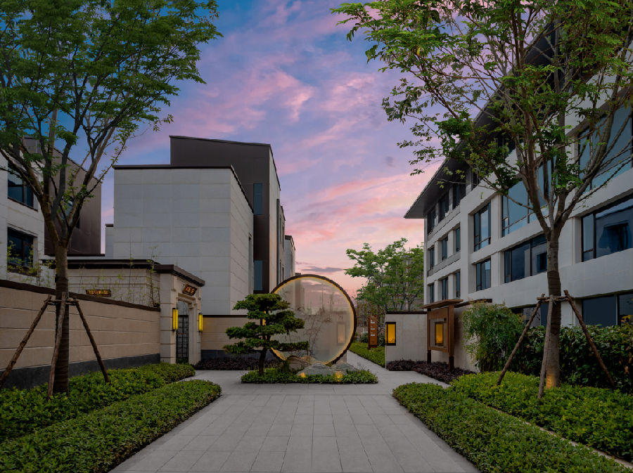 未入其园,先观其景。以“门-堂-园-溪-府”五大礼序,构建一个开敞而自由的空间。若隐若现的入户设计,呈现静谧生活体验。主路通直大气,园中水、石、树次第出现,在开合视野之中呈现出“柳暗花明”的豁朗与惊喜;名贵罗汉松植株高挺,透露出一股津门专属苍穹豪迈气势;宫灯映衬,山石雕塑、褐色金属格栅等细腻简洁的雅怀符号。古朴清韵的央景中轴,更构成空间上的起承转合,城市山水意境不请自来。