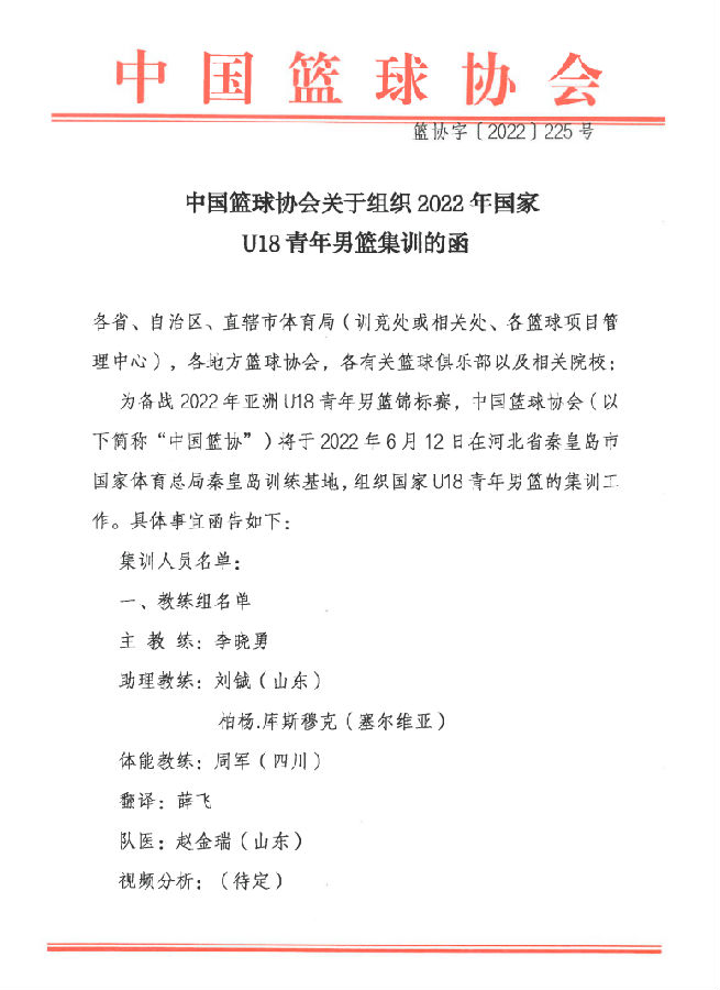同日,中国篮球协会还公布了《关于组织2022年国家U18青年男篮集训的函》,文一青年队队员许然入选本次集训名单,他将于6月12日前往国家体育总局秦皇岛训练基地参加本次集训。