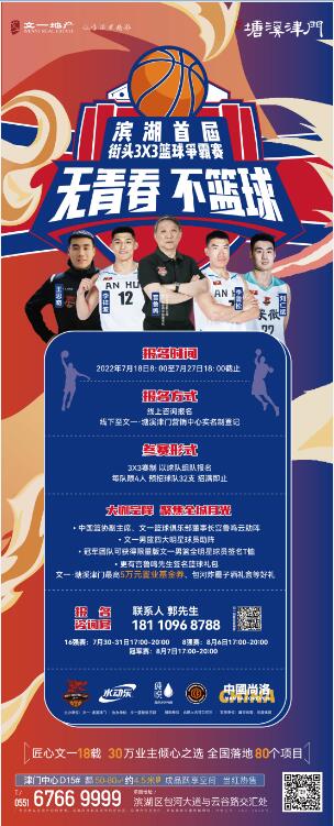 此次滨湖首届街头篮球争霸赛,由文一·塘溪津门邀文一篮球俱乐部鼎力支持协办,中国篮协副主席、文一篮球俱乐部董事长宫鲁鸣云助阵,并率文一男篮四大明星球员强势助阵,打造一场关乎篮球的热血夏天!