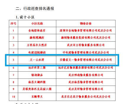 近日,武汉东西湖区住房和城乡建设局发布了《东西湖区2022年第二季度物业小区行政监督巡查通报》,武汉文一云水湾物业服务中心凭借综合管理服务、公共秩序维护管理、共用设施设备维护管理、共用部位卫生环境和绿化养护、常态化疫情防控检查等板块巡查中的出色表现,跻身行政监督巡查排名榜第5名,物业服务管理工作获得上级主管部门认可。