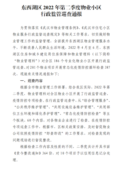 据了解,本次行政监督巡查排名由东西湖区住房和城乡建设局根据《武汉市物业管理条例》、《武汉市住宅小区物业服务行政监督巡查规定》等相关工作要求,于4-6月对全区186个物业小区开展行政监管巡查、对201个物业项目开展常态化疫情防控循环检查之后得出,因此排名兼具公正性和权威性。