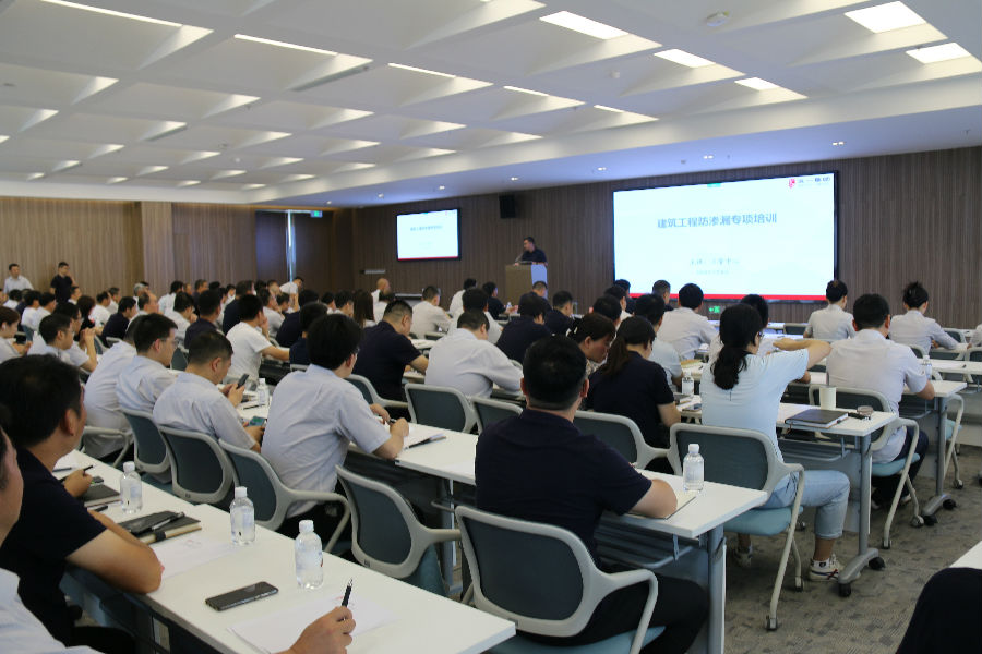 集团副总裁、房地产集团副总裁童乃兵在开场中表示,工程人员一定要精于业务、严于管理、尊重科学,把细节做到位,希望通过本次培训让大家始终不忘初心、坚守匠心。房地产集团工管中心总经理马剑锋担任本次主讲,他在授课中说到:“房屋渗漏是业主收房时普遍担心的问题,我们工程条线人员必须在施工过程中,坚持推行标准做法,把建筑品质做精做细做实。”