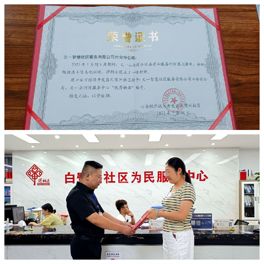 文一政务高新肥西服务下辖项目六安云河湾凭借2023年上半年的扎实工作,使小区的物业服务品质和水平均得到较大提升,获得了小区业主们的一致好评。继本年度四月份荣获六安经济技术开发区第一季度二类住宅小区评比第一名之后,2023年7月20日,六安经济技术开发区白鹭洲社区又为云河湾服务中心颁发了荣誉证书,授予服务中心“优秀物业”称号。
