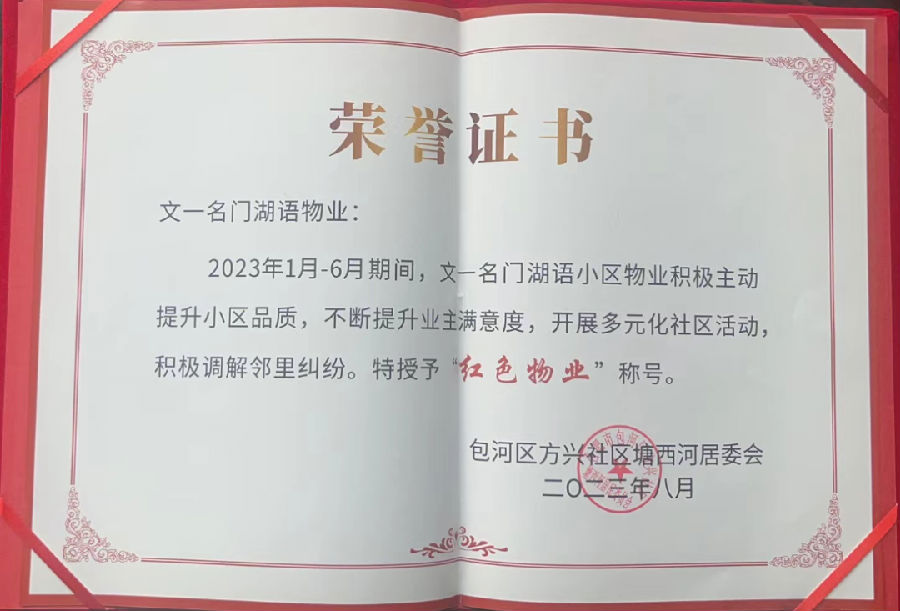 文一滨湖服务下辖项目名门湖语小区在2023年上半年物业服务工作中,积极主动提升小区品质,不断提升业主满意度,开展多元化社区活动,积极调解邻里纠纷,受到上级主管部门认可,于8月7日获得包河区方兴社区塘西河居委会授予的“红色物业”称号。