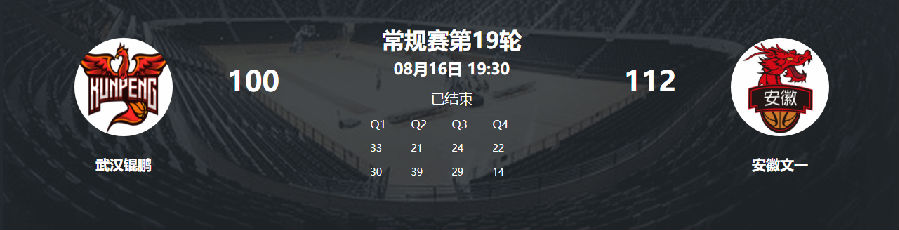8月16日晚,NBL常规赛第19轮拉开战幕,安徽文一客场对阵武汉锟鹏。凭借着达卡里·约翰逊准三双的全面发挥,五人得分上双的文一男篮以112-100轻取武汉队,继续排名积分榜首位。