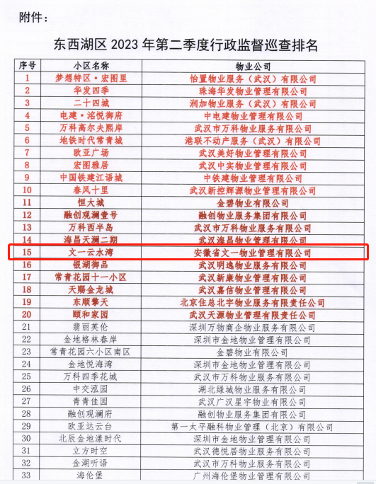 近日,武汉市东西湖区2023年第二季度物业小区行政监督巡查排名结果公布。文一滨湖服务下辖项目武汉云水湾在本次202个物业小区中排名第十五,物业管理工作获得当地上级主管部门认可。