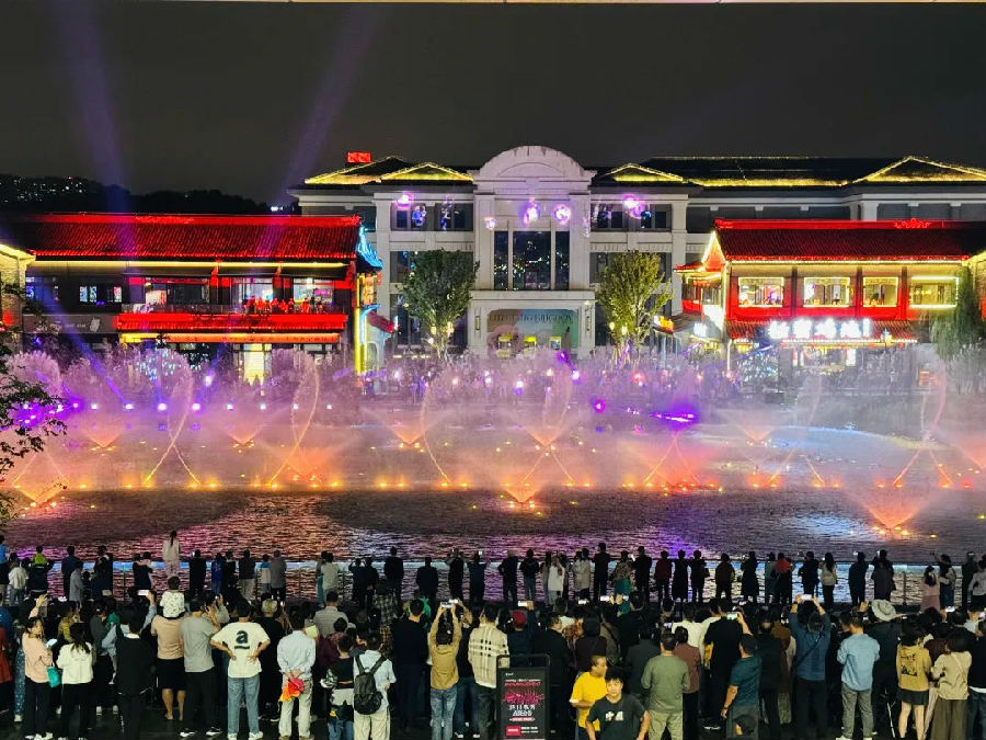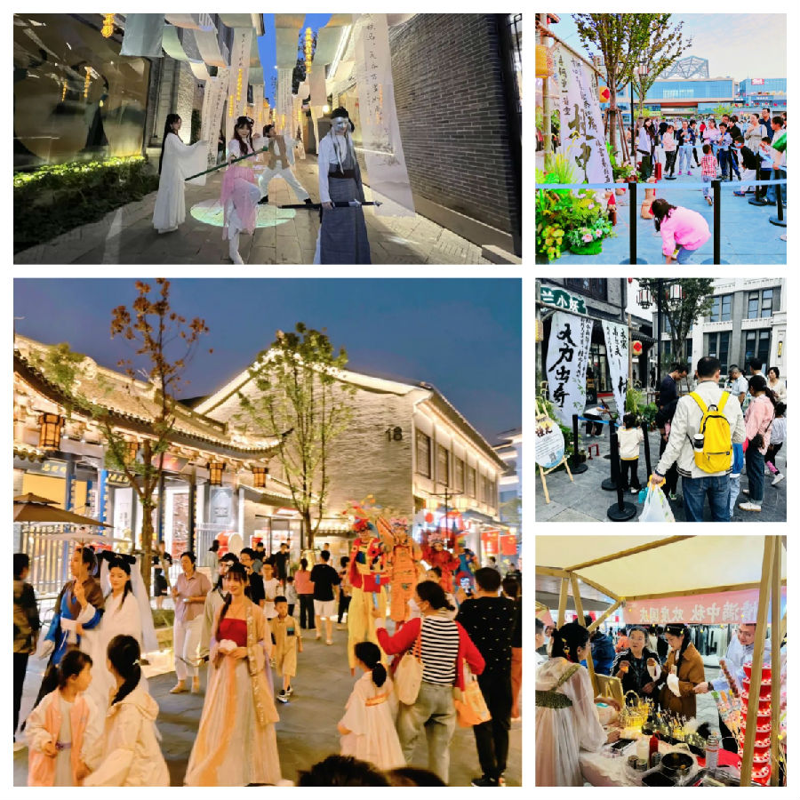 绚丽而缥缈的水秀,热闹而喧嚣的人群,卖弄绝活的脸谱高跷匠人、金庸武侠里的英雄人物、国风市集摊位前认真研究文创物品的游客,这是一场所有人都沉浸其中尽情畅玩的盛会。在水街国庆奇妙之旅中,我们体验到千年前宋人最爱的投壶、踢毽子、捶丸、猜灯谜,在智勇闯关里,寻见与古人遥隔千年的志趣相投。国风文创小铺汇成一里长街津彩市集,在卖货郎的吆喝声里,铺主和往来游客交流着那些藏在手工背后的小心思,琳琅满目的商品,斑斓了假日的明媚好心情。