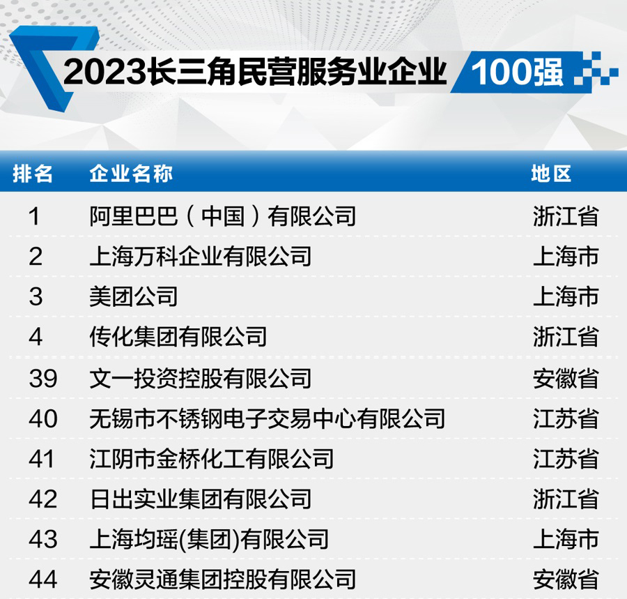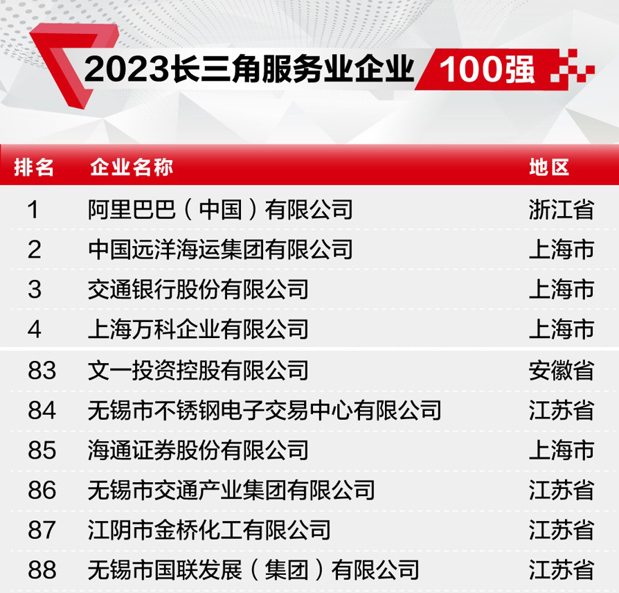 12月6日,2023长三角百强企业榜单正式发布。文一集团以约275亿元的年度营收跻身2023长三角服务业企业百强第83位,长三角民营服务业企业百强第39位,稳居安徽民营服务业企业三甲。
