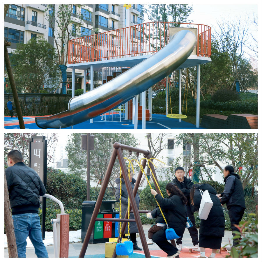 随着步履继续向前,儿童游乐园跃然眼前,超大滑滑梯满足所有孩子的童年梦想,不少看房的业主们已经迫不及待地玩上了荡秋千,回味孩子的快乐,放松嗨玩,放飞心情。漫步在仪式感满满的游园步道,使人身心沉静、心绪舒朗,随时感受人与自然和谐共处。