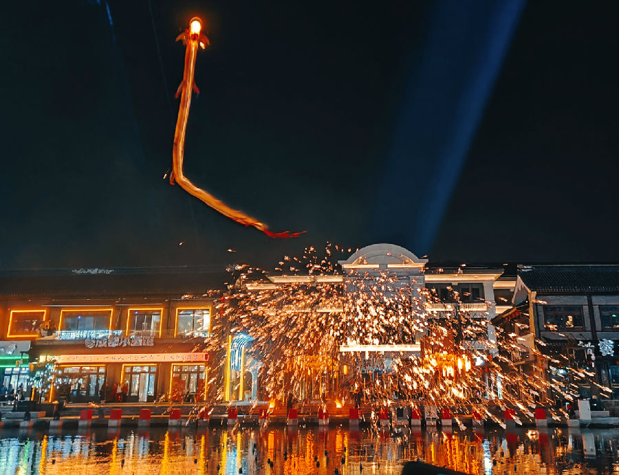 “更吹落,星如雨”,非遗匠人朝着夜空扬起1600℃铁汁,一场起源于大宋的火树铁花惊艳绽放在我们眼前。火龙呼啸着,在璀璨铁花间翱翔升空,赢得游客们纷纷鼓掌喝彩,用手机记录下这美轮美奂的光影景象。