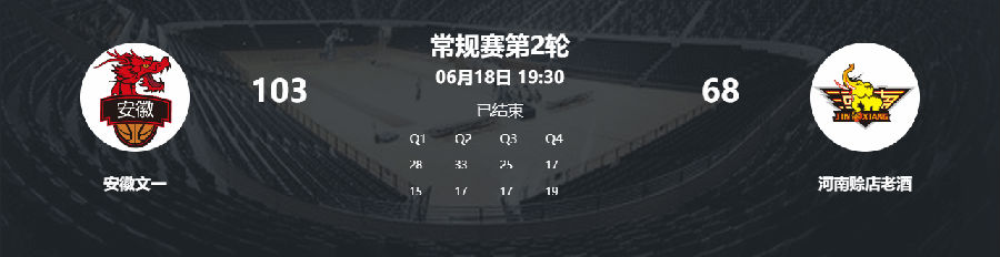 6月18日,继续坐镇主场的安徽文一迎来河南赊店老酒的挑战。凭借着首节22:2的超强进攻高潮,火力全开的安徽文一早早确立领先优势,最终以103:68大胜对手,取得两连胜。