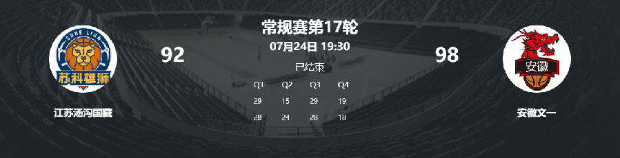 7月24日晚,安徽文一在NBL常规赛第17轮比赛中客场对阵江苏汤沟国藏。在“双J”组合合砍63分的强势带领下,安徽文一以98:92力挫江苏队,取得六连胜。
