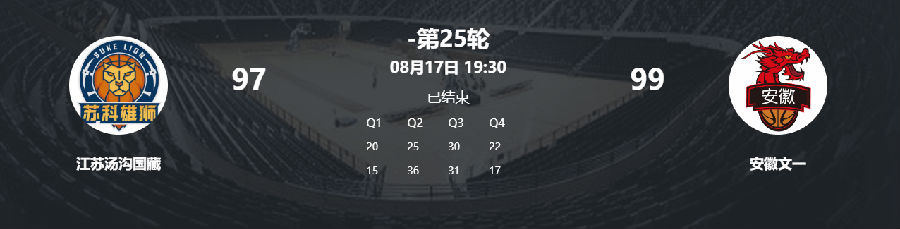 8月17日晚,安徽文一在NBL常规赛第25轮比赛中客场对阵江苏汤沟国藏。在达卡里·约翰逊五犯离场的不利局面下,特洛伊·吉伦沃特再度发力,狂砍44分9篮板,帮助安徽文一以99:97险胜江苏队。凭借本场胜利,安徽文一提前一轮锁定常规赛冠军。