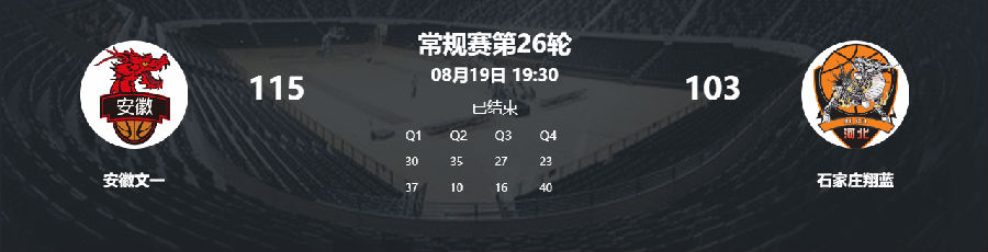 8月19日,NBL常规赛迎来收官战。锁定常规赛冠军的安徽文一坐镇主场,迎来石家庄翔蓝的登门拜访。凭借薛傅文第二节7投7中的三分球,弹无虚发的神级发挥,次节轰出30-3进攻狂潮的安徽文一最终以115:103轻取石家庄队。季后赛首轮,安徽文一将对阵第八名的合肥狂风。安徽德比,季后赛再度上演!