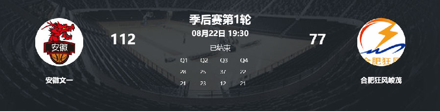 8月22日,NBL季后赛全面开战。安徽文一坐镇主场,迎战同为安徽球队的合肥狂风。全场保持领先的安徽文一第三节发力,单节净胜25分。最终,12名球员全部得分的安徽文一以112:77大胜合肥队,总比分1:0领先同时手握季后赛首轮赛点。