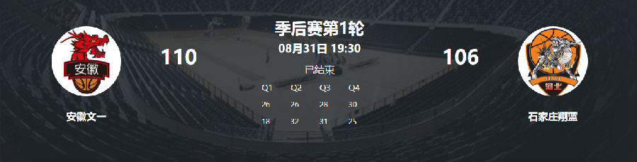 8月31日晚,安徽文一迎来NBL半决赛首战,坐镇合肥体育中心体育馆,迎战石家庄翔蓝。在全场比分始终胶着的局面下,受到犯规困扰的特洛伊·吉伦沃特末节接管比赛,独砍17分。在距离比赛结束还有19.8秒时,高锦玮弧顶三分命中,一剑封喉,安徽文一最终以110-106险胜石家庄,系列赛1-0领先对手!