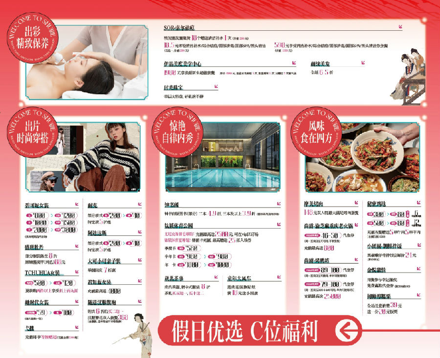 为促进消费动力,运营部主动出击,优选水街商户,围绕秋日的季节特征,从时尚衣装、个人保养、风味美食、休闲文娱等多个方面开展消费联动。钟书阁、钛镁体育公园、君知蓝、尚爵餐饮等30多家商户参与其中。从餐饮到文创,从手工艺品到特色游玩,各种业态齐发力,极大地丰富了游客的消费选择。