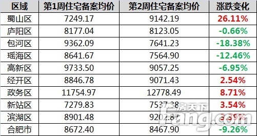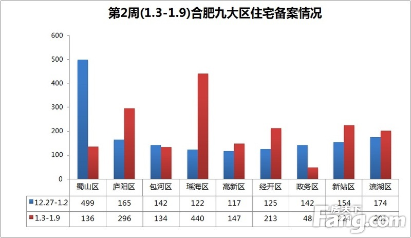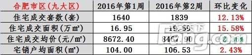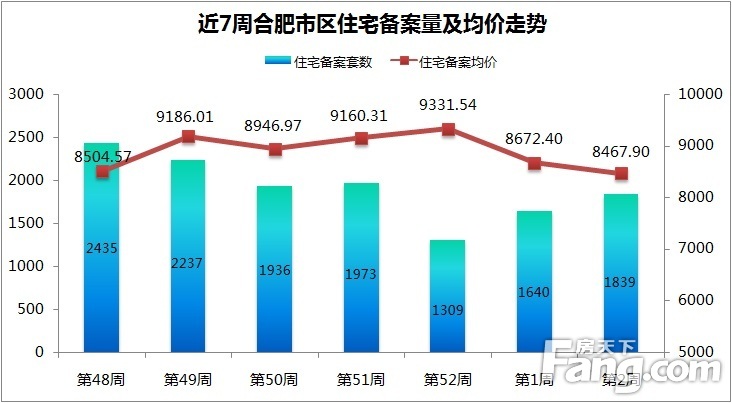 上周合肥楼市综述:2016年第2周(2016.1.3-2016.1.9)合肥市区住宅备案1839套,环比涨12.13%,住宅备案面积19.59万㎡,环比涨15.58%。合肥市区住宅备案均价8467.90元/㎡,环比跌2.36%。住宅销售户均面积106.53㎡,环比涨2.43%。