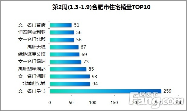 上周合肥市区住宅销量TOP10楼盘,第1名是瑶海区的文一名门皇马259套;第2名是北部组团的北城世纪城94套;第3名是庐阳区的文一名门湖畔93套。上周TOP10盘仅1项目住宅销量超100套。另外,上周文一共计5盘进TOP10。