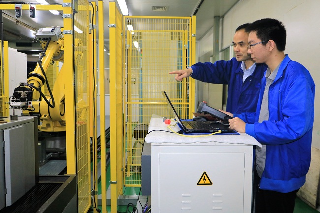记者发现,该生产车间以往需要大量工人在一线作业,现在已经由2台轴关节机器人和13台二轴非标机器人承担。“原先一条生产线需要13到15名工人,现在只需要3到5名工人。而且,产品质量大幅提高,精度可以达到0.1毫米左右。”该公司总经理郑德宝说。