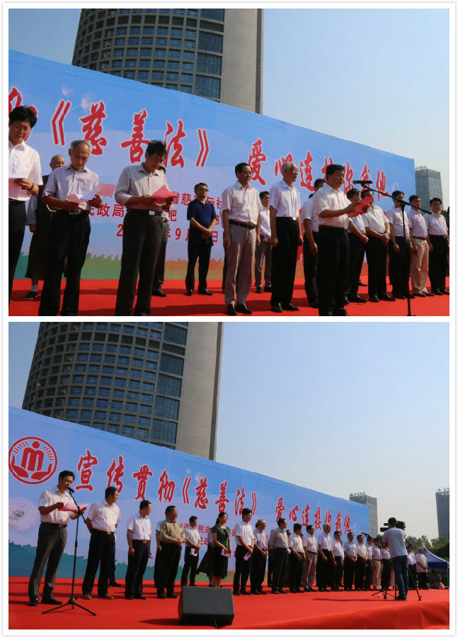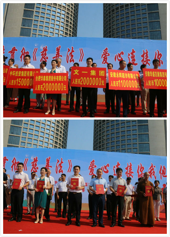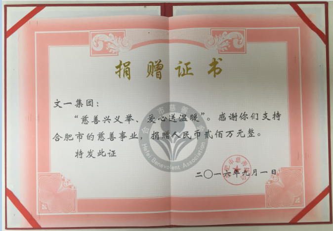 为广泛动员社会各界和广大市民,学习宣传《慈善法》的重大意义,营造“扶危济困,共同参与”的良好社会氛围,9月1日上午,在市政务中心人民广场,合肥市宣传贯彻《慈善法》宣传月活动启动仪式隆重举行。文一集团董事长周文育作为爱心企业代表受邀出席。文一集团在本次仪式上举牌捐赠善款200万元,获合肥市慈善协会颁发“慈善兴义举,爱心送温暖”捐赠证书。