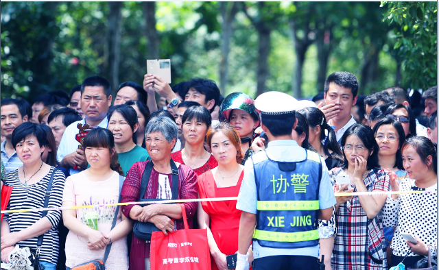 对陪考的家长来说,户外30℃左右的高温同样是种“烤验”。考试临近,大批考生及家长蜂拥而至,爱心驿站的志愿者们为他们提供饮品并送上祝福,考生带着感谢的微笑进入考场。
