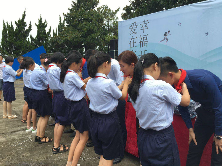 之后,学生代表上台为出席活动的领导们系上红领巾,以手系之礼向他们表达真挚的感谢,并在台前合影以作留念。
