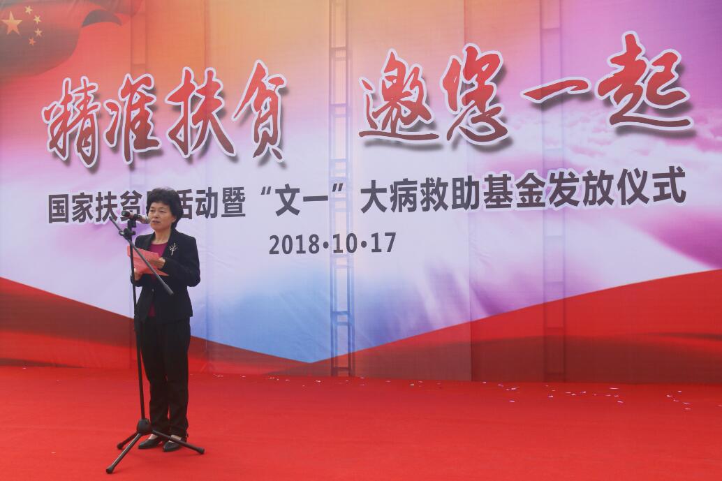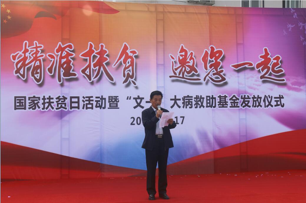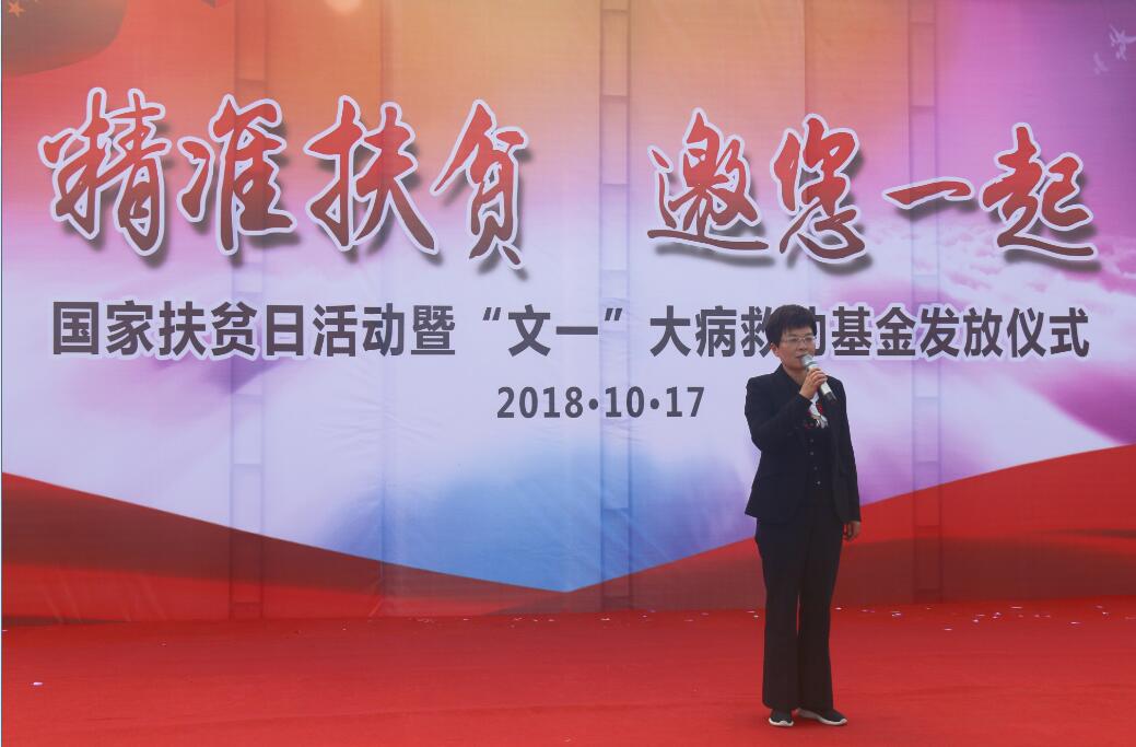 10月17日,时值第五个国家扶贫日,同时恰逢九九重阳节,“精准扶贫 邀您一起”国家扶贫日活动暨“文一”大病救助基金发放仪式在巢湖市烔炀镇举行。合肥市政协副主席、市工商联主席姚亚妹,巢湖市政协副主席、市工商联主席程素萍,文一集团党委书记、纪委书记韦存华及巢湖市慈善协会、烔炀镇有关领导出席仪式现场。