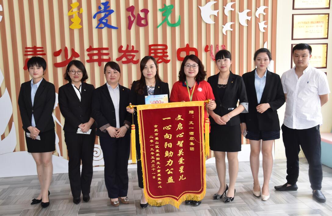 5月31日,文一酒店集团副总经理孙庆莉、一品宴肥东宾馆总经理兼和平大酒店总经理陈晓霞带领各酒店代表一行八人来到“合肥市蜀山区至爱阳光儿童康复中心”,为这里的自闭症孩子们捐赠儿童滑梯,并在至爱阳光园长许琳女士的陪同下,陪着孩子们提前庆祝六一。