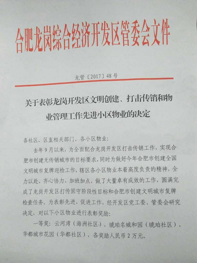 8月24日,合肥龙岗开发区管委会发布关于辖区文明创建、打击传销和物业管理先进小区物业的决定,文一?云河湾小区荣获一等奖,奖金2万元,文一·瑞泰和园小区获三等奖,奖金0.5万元。