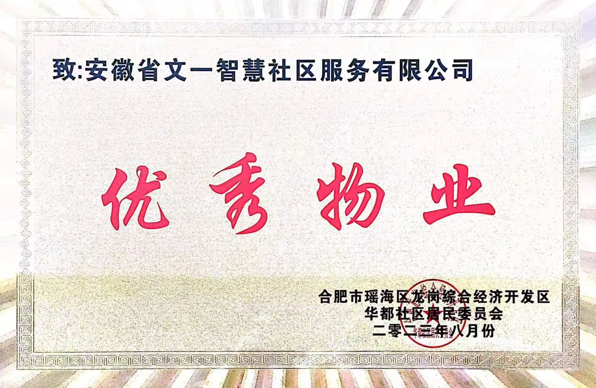 2023年上半年,文一瑶海新站服务下辖项目文一名门学府、文一名门广场项目的服务品质取得较大的提升,业主满意度稳步提高。近日,合肥市瑶海区龙岗综合经济开发区华都社区授予瑶海新站服务“优秀物业”称号,并授予文一名门学府、文一名门广场项目“优秀示范小区”称