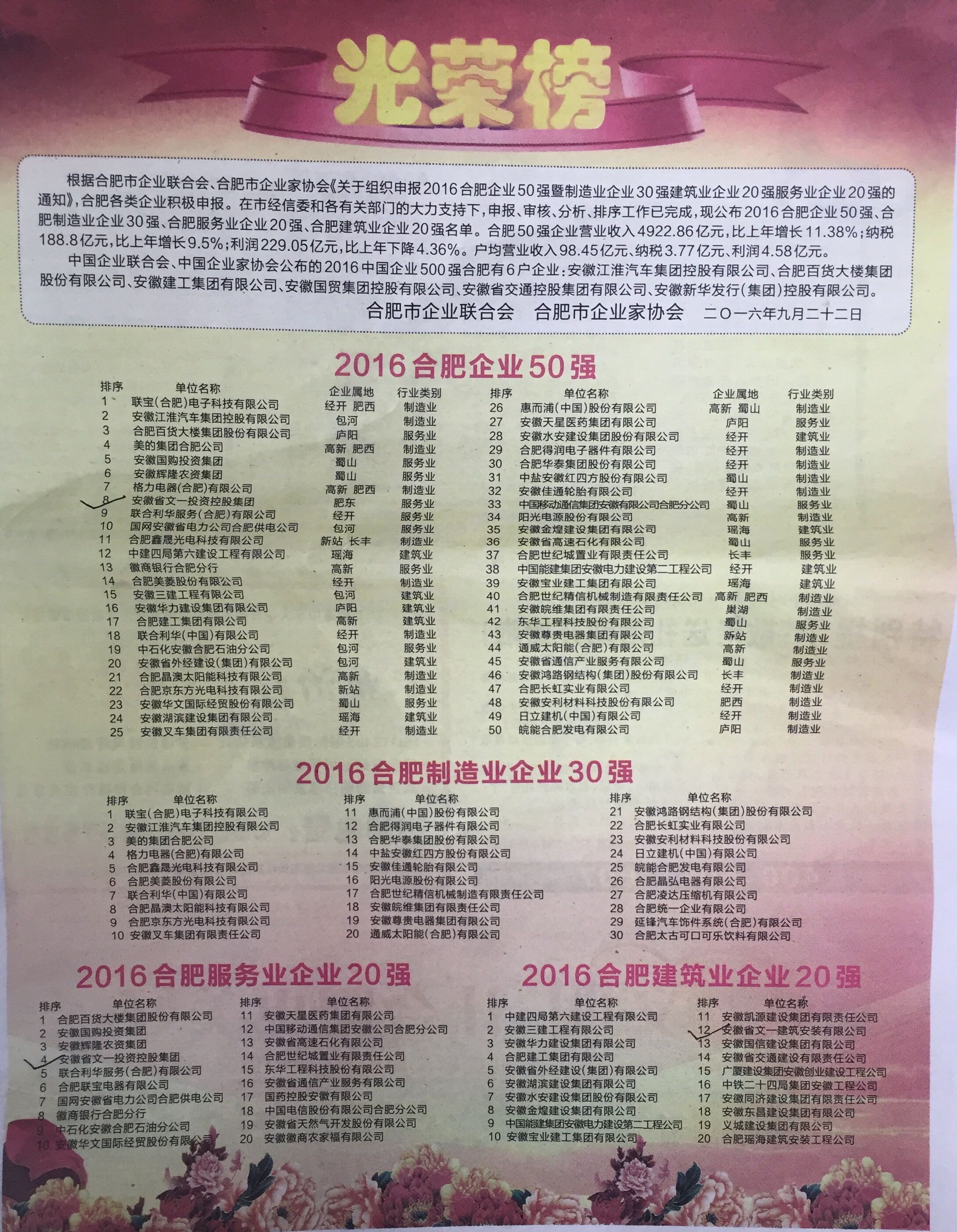 日前,合肥市企业联合会、合肥市企业家协会联合发布《2016合肥企业50强》、《2016合肥服务业企业20强》、《2016合肥建筑企业20强》榜单,文一集团排名《2016合肥企业50强》第8位、《2016合肥服务业企业20强》第4位,安徽省文一建筑安装