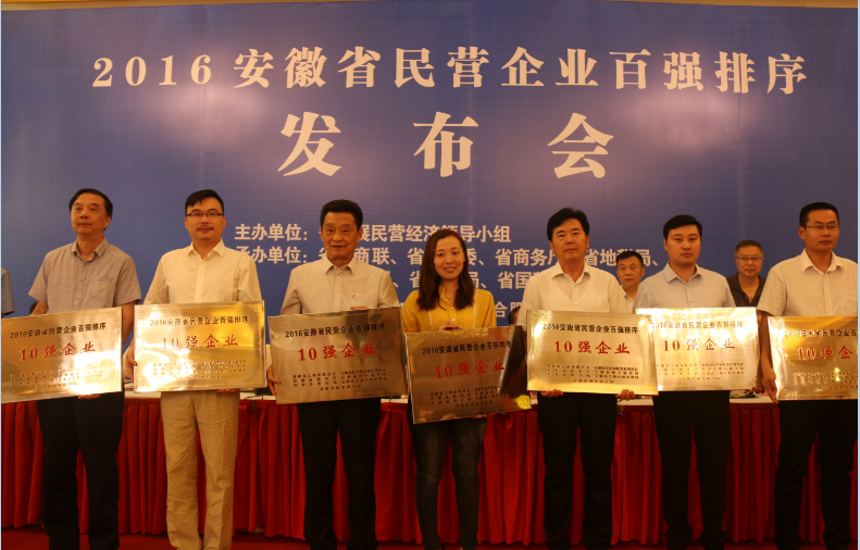9月27日,2016安徽省民营企业百强排序发布会隆重举行,文一集团在会上被授予“安徽省民营企业10强”荣誉称号,排名2015年度安徽省民营企业纳税百强第三位,营收百强第四位。