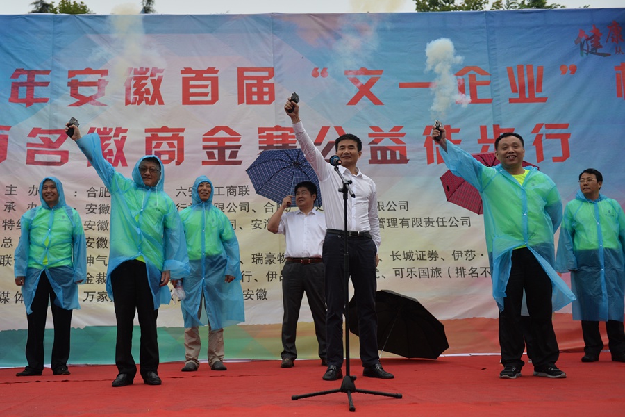 6月25日上午8点,2016安徽首届“文一企业杯”百名徽商金寨公益徒步行在六安市金寨县国家登山步道红军广场启动。