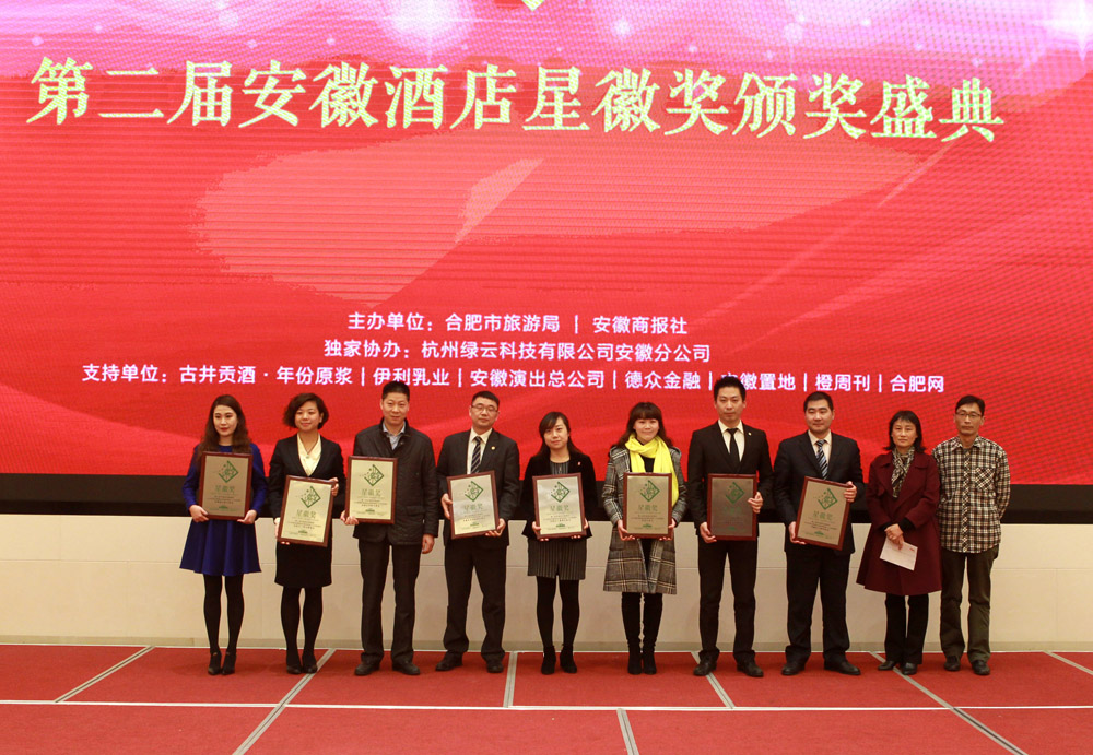 12月11日,2015第二届安徽酒店星徽奖颁奖盛典暨高峰论坛在合肥滨湖白金汉爵大酒店举办,13个奖项逐一揭晓,安徽文一戴斯大饭店获得其中“2015年度安徽酒店业十大商务型酒店”和“2015年度安徽酒店业最受商旅人士欢迎酒店”两项大奖。