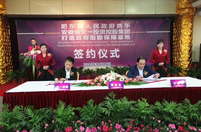 11月19日下午,肥东县政府携手文一集团打造政府后勤保障基地签约仪式在肥东宾馆三楼大会堂举行。肥东县常委常务副县长张红军、安徽省文一投资控股集团董事长周文育出席仪式并致辞,县行政管理局局长盛业波、文一集团工会主席餐饮旅游板块负责人周文锁分别代表合作双