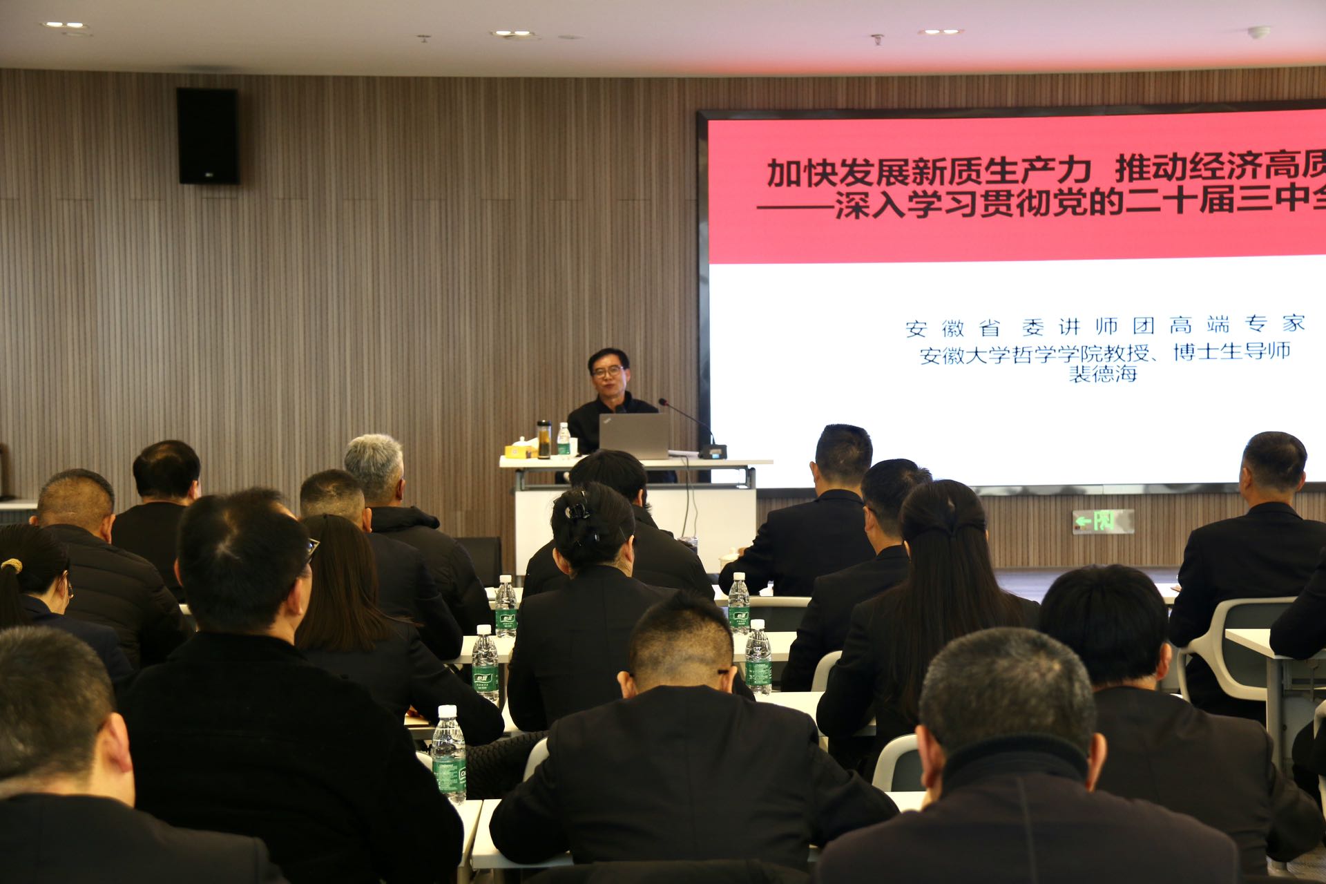 12月17日,为深入学习贯彻党的二十届三中全会精神,文一集团党委特邀安徽省委讲师团高端专家,安徽大学哲学院教授、博士生导师裴德海,以“加快发展新质生产力、推动经济高质量发展”为主题,为集团全体党员、预备党员、入党积极分子讲授专题党课,使集团全体党员不
